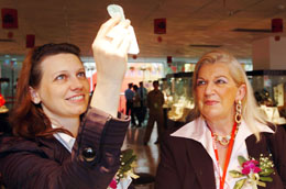 2007年11月1日,來自意大利的兩名珠寶商在鑒賞寶石。當(dāng)日,第四屆梧州國際寶石節(jié)在梧州市寶石城舉行,來自18個國家和地區(qū)與國內(nèi)近3000名客商參會。梧州市人工寶石年產(chǎn)量達(dá)3600噸約120億粒。占世界產(chǎn)量的70%。