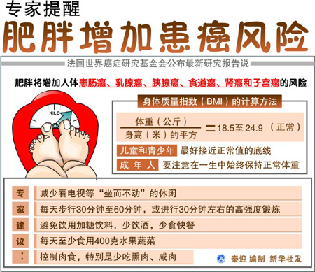 這項研究成果綜合了全球7000項癌癥成因研究,歷時五年得出。其中最早的記錄可追溯至20世紀(jì)60年代。研究小組成員是來自各國的21名知名專家。 人們已經(jīng)知道,肥胖不利于癌癥患者。但研究發(fā)現(xiàn),飲食、體重與癌癥的關(guān)聯(lián)遠(yuǎn)超人們想像。研究者列出了六種受肥胖影響較大的癌癥,稱已找到“令人信服的”證據(jù)能證明二者確有關(guān)聯(lián)。六種癌癥分別為:食道癌、胰腺癌、直腸癌、子宮癌、腎癌、更年期乳腺癌。 世界癌癥研究基金會10年前的一份研究報告只列出了一類可能與體內(nèi)脂肪有關(guān)的癌癥,如今的新報告多列出了另外五類癌癥。 保持正常體重是專家建議中的重要一條。研究小組負(fù)責(zé)人邁克爾·馬爾莫說:“我們建議,在健康范圍內(nèi),人們應(yīng)盡可能保持苗條,并在成年后把控制體重變成一種習(xí)慣! 英國《每日電訊報》援引英國癌癥研究會的數(shù)字說,若控制體重得當(dāng),全英每年將有1.2萬人逃脫癌癥魔爪。