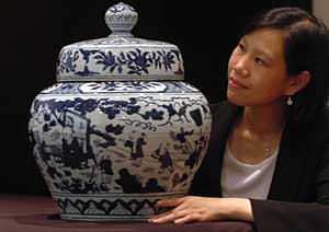 | 明嘉靖青花《庭院嬰戲圖》蓋罐,拍品估價(jià)為3000萬(wàn)港元。新華社記者 黃本強(qiáng)