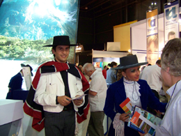 第12屆拉丁美洲國際旅游展17日在阿根廷首都布宜諾斯艾利斯拉魯拉爾展覽中心拉開帷幕。來自拉美以及加勒比50多個國家和地區(qū)的1800個旅游機(jī)構(gòu)、企業(yè)參加了此次展會。圖為智利“奎卡”舞演員正向參觀者分發(fā)資料。