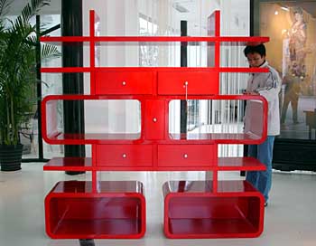 蘇州市山塘街一家具店內(nèi)展示的富有創(chuàng)意的家具十分引人注目。這些家具將實(shí)用性與藝術(shù)性巧妙地融為一體,構(gòu)思奇特。圖為一名顧客欣賞“紅雙喜”字造型的家具。