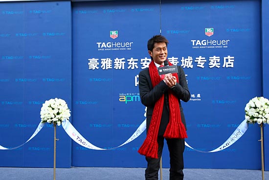 S計(jì)時(shí)碼表“中國(guó)之隊(duì)”限量版腕表。該款腕表不僅擁有卓越性能,更在鋁制表圈裝飾有紅黃兩種中國(guó)之隊(duì)的專(zhuān)有顏色。 圖為影視紅星古天樂(lè)在豪雅表專(zhuān)賣(mài)店開(kāi)業(yè)儀式上助興。本報(bào)資料照片 | |