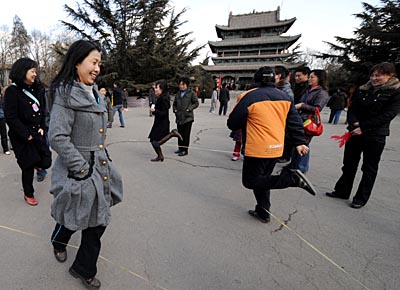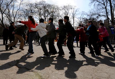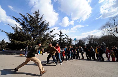 太原市20多位市民日前帶著孩子來到迎澤公園,重溫兒時和小伙伴們一起玩耍的情景,老鷹捉小雞、跳皮筋、丟沙包等游戲讓這些成年人似乎重新回到了童年。