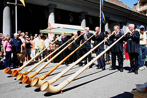 | 圖為在瑞士沃韋舉行的第15屆街頭藝人節(jié)上,幾位藝人在街頭吹響阿爾卑斯號(hào)角。新華社記者 楊京德