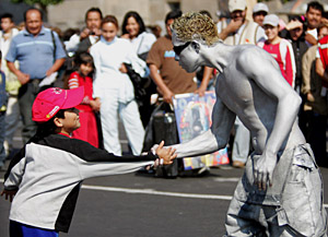 | 在墨西哥首都墨西哥城街頭,一名藝人跟游客進(jìn)行互動(dòng)表演。墨西哥城有許多藝人在街頭表演,豐富了市民的娛樂(lè)生活。新華社記者
