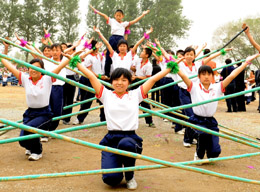 5月27日,“積極推進(jìn)‘陽(yáng)光工程’,促進(jìn)學(xué)生體質(zhì)健康發(fā)展論壇”在長(zhǎng)春開幕,此次活動(dòng)的重要內(nèi)容之一是長(zhǎng)春市雙陽(yáng)區(qū)“陽(yáng)光體育”成果展示。圖為長(zhǎng)春市回族中學(xué)的學(xué)生在表演竹竿舞。 |