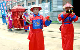 6月26日,沈陽關(guān)東影視城的演藝人員在表演“王府娶親”民俗節(jié)目。集中再現(xiàn)沈陽上個世紀20年代到30年代北市場市井民風的關(guān)東影視城,日前對中外游客開放。這個影視城坐落在棋盤山國際風景旅游開發(fā)區(qū)內(nèi),總建筑面積約3.8萬平方米,擁有各式建筑177棟。北市場原名“十間房”,是近代工商業(yè)興起、手工作坊向近代輕工業(yè)轉(zhuǎn)變及百姓市井文化的縮影。當年,與北京天橋、天津勸業(yè)場、上海城隍廟等齊名。
