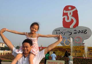 從深圳來北京旅游的劉怡靜(上)和爸爸在天安門廣場“舞動的北京”花壇前留影。本報記者:羅曉光 攝
