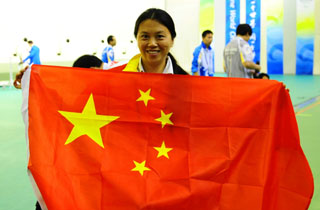 9月8日,中國(guó)選手林海燕手持國(guó)旗慶祝勝利。當(dāng)日,林海燕在北京2008年殘奧會(huì)P2級(jí)女子10米氣手槍(SH1)決賽中,以467.7環(huán)的總成績(jī)獲得金牌。