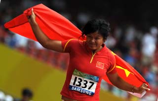 9月8日,中國(guó)選手姚娟在比賽后身披國(guó)旗慶祝勝利。當(dāng)日,北京2008年殘奧會(huì)田徑比賽在國(guó)家體育場(chǎng)“鳥巢”開(kāi)賽,姚娟以40米51的成績(jī)打破女子標(biāo)槍F42-46級(jí)世界紀(jì)錄,并獲得冠軍。