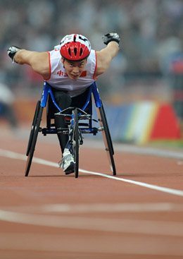 攝 | “我天生就喜歡速度的感覺(jué),那種在奔跑中風(fēng)從耳邊掠過(guò)的快感……” 雖然不幸因病截去了一條腿,但以輪椅為“戰(zhàn)車”的張立新,終于在北京殘奧會(huì)上實(shí)現(xiàn)了他從小的追風(fēng)夢(mèng)想。 14日晚6點(diǎn)半,鳥(niǎo)巢。男子4X400米T53-54級(jí)輪椅競(jìng)速接力賽,中國(guó)四員“飛車虎將”張立新、崔彥鋒、趙驥、李虎召以3分5秒67奪得冠軍,并且刷新了由他們?cè)谏衔鐒倓倓?chuàng)造的世界紀(jì)錄。當(dāng)最后一棒的張立新像風(fēng)一樣刮到終點(diǎn)時(shí),他已經(jīng)超出第二名足足有四十米遠(yuǎn)。 這是張立新第四次“站”在最高領(lǐng)獎(jiǎng)臺(tái)上,注視著國(guó)旗從眼前升起。在他參加的集體和單人共4個(gè)項(xiàng)目比賽中,全部摘下金牌! “他太讓人難以置信了,在賽場(chǎng)上他簡(jiǎn)直就是‘野獸’!边@是在14日男子200米T54級(jí)決賽后,和他同場(chǎng)競(jìng)技的前殘奧會(huì)冠軍、芬蘭名將泰赫蒂對(duì)張立新的評(píng)價(jià)。 能取得今天的驕人成績(jī),張立新在賽后最想感謝的人除了媽媽外,就是他的恩師——前國(guó)家輪椅競(jìng)速隊(duì)總教練田海江!斑@個(gè)月30號(hào)是田導(dǎo)去世一周年的日子,如果時(shí)間安排允許,我想去他的老家湖北武漢祭奠一下。田導(dǎo)生前最大的愿望就是在北京奧運(yùn)會(huì)上帶著我們奪取金牌! “他直到臨走動(dòng)手術(shù)前還在給我們寫訓(xùn)練計(jì)劃!比ツ陚鋺(zhàn)全國(guó)殘運(yùn)會(huì)的時(shí)候,田海江被查出胰腺癌晚期,三個(gè)月后過(guò)世。 帶著幫恩師實(shí)現(xiàn)遺愿的雄心,在本屆殘奧會(huì)上,張立新一次次地帶給大家驚喜!霸瓉(lái)想拿到一塊金牌就很高興了,沒(méi)想到越戰(zhàn)越勇。” 8日上午,北京殘奧會(huì)田徑比賽在“鳥(niǎo)巢”揭幕,張立新在男子400米T54級(jí)第一輪的比賽中,就打破殘奧會(huì)紀(jì)錄。 9日,張立新和隊(duì)友合力獲得男子4X100米接力T53-54級(jí)金牌。 10日,在男子400米T54級(jí)的決賽中,張立新一路領(lǐng)先斬獲冠軍,同時(shí)以45秒07的成績(jī)創(chuàng)造了新的世界紀(jì)錄。 14日上午,男子200米T54級(jí)決賽中,張立新以24秒34的成績(jī)奪冠。他在預(yù)賽中以24秒18的成績(jī)創(chuàng)下了新的世界紀(jì)錄。 14日晚上,男子4X400米接力T53-54級(jí)決賽,張立新和三名隊(duì)友用金牌和破世界紀(jì)錄的成績(jī)?yōu)樽约旱谋本垔W之旅完美收官。 身高1米80,長(zhǎng)得陽(yáng)光帥氣的張立新從小喜歡運(yùn)動(dòng),在學(xué)校時(shí)是校足球隊(duì)的主力前鋒。后來(lái),因?yàn)楣侨饬霾坏貌唤厝ヒ粭l腿,但這并沒(méi)有毀掉張立新的體育之路。此后,張立新打過(guò)一段時(shí)間的輪椅籃球,但當(dāng)他第一次看到輪椅競(jìng)速比賽時(shí),場(chǎng)上風(fēng)馳電掣的場(chǎng)面再次點(diǎn)燃了他心中的追風(fēng)夢(mèng)想。 輪椅競(jìng)速的訓(xùn)練枯燥、艱苦。張立新介紹說(shuō),輪椅的操控主要來(lái)自雙手的快速摩擦,就算是戴著皮手套,同樣會(huì)帶來(lái)?yè)p傷。在賽后接受采訪時(shí),張立新把雙手伸到記者面前說(shuō):“你們看,兩只手都練得變型了,骨節(jié)都比較大! 同時(shí),運(yùn)動(dòng)員參加比賽所用的輪椅并不好控制,“我們的重心都在后面,控制不好就會(huì)側(cè)翻,尤其是在下雨的時(shí)候!睆埩⑿戮驮谝淮斡(xùn)練中因?yàn)閭?cè)翻而摔成腦震蕩!爸钡浆F(xiàn)在,累的時(shí)候還會(huì)有點(diǎn)頭疼,”他說(shuō)。 雖然付出了巨大的努力,但張立新成長(zhǎng)的道路也并非一帆風(fēng)順。四年前的雅典殘奧會(huì),張立新僅僅獲得一個(gè)第六名。 從雅典的第六到北京殘奧會(huì)獲得四金,張立新付出了太多的努力。這里面也包含了田海江教練的精心調(diào)教。“他知道我們殘疾人運(yùn)動(dòng)員需要什么,也知道怎么管理和訓(xùn)練我們,這是他最獨(dú)特的地方! 梅花香自苦寒來(lái)。日復(fù)一日的苦練,讓張立新逐漸躋身世界頂級(jí)選手的行列。他和隊(duì)友一起,獲得了世錦賽、亞運(yùn)會(huì)的冠軍,但他最希望的,還是能在北京奪冠。 張立新最終實(shí)現(xiàn)了他的夢(mèng)想,他的下一個(gè)目標(biāo)在四年后的倫敦。