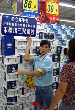 9月24日,在海口某超市,蒙牛牛奶推出優(yōu)惠活動,并標出牛奶不含三聚氰胺的標志。目前,蒙牛、伊利等奶制品商家都在?谑懈鞔蟪匈N出公告,承諾目前所售產品已通過檢驗,市民可放心飲用。鑒于消費者對商品的信心還有待恢復,部分商家積極開展了各類促銷活動。
