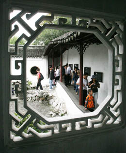 10月4日,在蘇州古典園林獅子林,游客從造型別致的花窗旁經(jīng)過。新華社發(fā)(杭興微