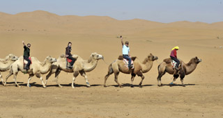 10月2日,游客在騰格里沙漠騎駱駝游玩。新華社記者:李欣