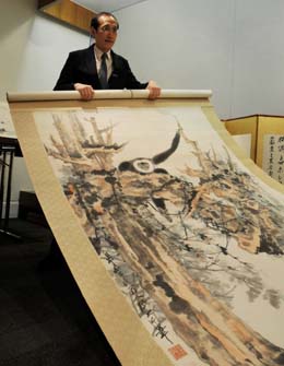 香港蘇富比工作人員在介紹張大千的作品《老樹(shù)騰猿》。新華社記者:孫浩