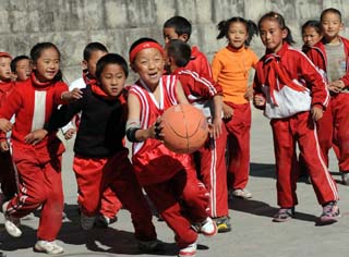 云南省迪慶藏族自治州德欽縣地處云南和西藏的交界地帶,海拔3400多米。近年來(lái)當(dāng)?shù)氐拿褡褰逃聵I(yè)蓬勃發(fā)展,藏族孩子的入學(xué)率達(dá)到99%以上,切實(shí)保障了適齡兒童受教育的權(quán)利。從2007年起,德欽縣還實(shí)施了“藏區(qū)高原農(nóng)牧民子女學(xué)生生活補(bǔ)助工程”,讓當(dāng)?shù)厣先f(wàn)名農(nóng)牧民孩子受益。如今藏族孩子們坐在寬敞明亮的教室里接受現(xiàn)代文明的教育,一天天地茁壯成長(zhǎng)。 云南省迪慶藏族自治州德欽縣示范小學(xué)的學(xué)生正在打籃球。 |