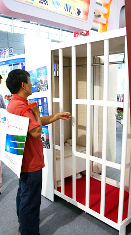 在第十屆高交會上展出的由四川綿竹人陳典福發(fā)明的“抗震護(hù)身空間”。據(jù)介紹,“抗震護(hù)身空間”平時可用來儲放衣物,當(dāng)?shù)卣、臺風(fēng)、龍卷風(fēng)等自然災(zāi)害來臨時,它可變成小型“避難所”,為使用者提供生命安全保障。 (杜鵑 攝)