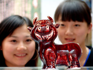兩名參觀者在景德鎮(zhèn)中國陶瓷博物館被顏色釉生肖牛瓷雕《咪咪!匪P氯A社發(fā)(石衛(wèi)明