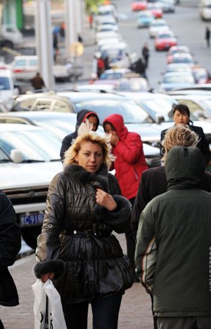 俄羅斯游客在綏芬河市街頭。本報(bào)記者:王建威
