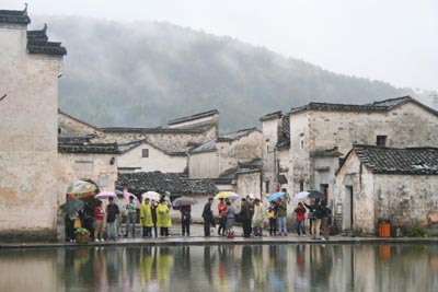 在長江下游的皖南山區(qū),散布著許多數(shù)百年來風(fēng)貌依舊的古村落,而位于安徽黟縣境內(nèi)的西遞和宏村最負(fù)盛名,被譽為“中國畫里鄉(xiāng)村”。改革開放初期,西遞和宏村開始利用其獨具魅力的徽州文化和獨特的自然景觀發(fā)展旅游經(jīng)濟,走出了一條依托旅游經(jīng)濟來保護和傳承徽州文化遺產(chǎn)的發(fā)展道路。 圖為游人在雨霧中游覽宏村月沼。 |
