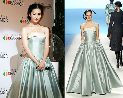 | 劉亦菲在參加某活動(dòng)時(shí)穿著的禮服被指酷似某大牌禮服,故被網(wǎng)友戲稱(chēng)為山寨禮服。(資料照片) |