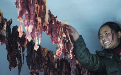 1月2日,一名藏族婦女在自家晾曬牛肉。 每年冬季,西藏各地的農(nóng)牧民家家戶戶晾曬風(fēng)干牛肉,不少家庭專門建造一間四周通風(fēng)的房間來制作風(fēng)干肉,像葡萄架一樣搭著的架子和繩子,繩子上面掛滿了條狀的牛肉,干燥的冷風(fēng)把肉吹干,風(fēng)干肉嚼起來既酥又有韌勁是藏家招待客人的最佳食品。