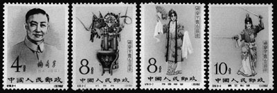 1962年發(fā)行的“梅蘭芳舞臺藝術(shù)”紀(jì)念郵票共8枚,除第一枚4分的圖案為梅蘭芳像外,其余7枚都選用梅蘭芳生前不同時(shí)期在舞臺上塑造的具有代表性的藝術(shù)形象為圖案。 “梅蘭芳舞臺藝術(shù)”紀(jì)念郵票中的4枚(自左至右):第一枚4分,圖為梅蘭芳像;第二枚8分,“抗金兵”里的梁紅玉;第三枚8分,“游園驚夢”里的杜麗娘;第四枚10分,“霸王別姬”里的虞姬。新華社發(fā)