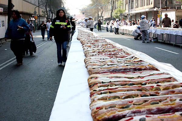 當日,墨西哥國家面包工業(yè)商會在墨西哥城的11月20日大街舉行制作大面包活動。制作的面包長1600多米,重達1萬多公斤。制作這個大面包消耗了6600公斤面粉,3000公斤奶油,44000個雞蛋,1500升牛奶,2000公斤食糖等。共有2300人從4日凌晨3點開始制作,直到6點結束,耗資100萬比索(1美元約合13比索)。