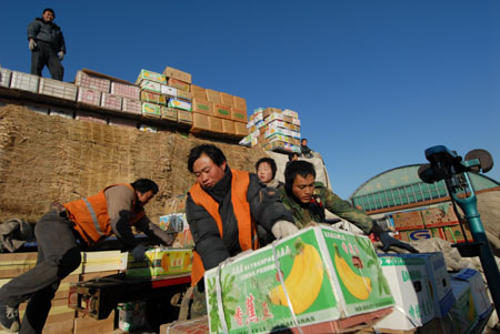 1月12日,工人在北京新發(fā)地農(nóng)產(chǎn)品市場搬運水果。