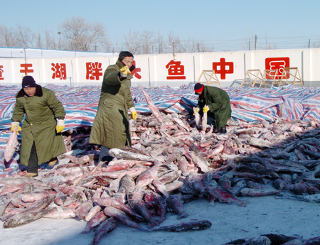 14日,吉林省查干湖漁場到庫房里里擺滿了剛剛捕上來到魚,很多游客驅(qū)車到這里購買鮮魚。數(shù)九隆冬,吉林省查干湖又迎來了冬季捕魚的黃金時(shí)節(jié)。隨著當(dāng)?shù)芈糜螛I(yè)的發(fā)展,查干湖漁業(yè)資源也得到有效開發(fā),很多游人頂風(fēng)冒雪跑到冰冷的湖面上爭睹萬魚躍網(wǎng)的壯觀場面。日前,吉林省查干湖冬捕以單網(wǎng)出魚量16.8萬公斤,打破了2006年創(chuàng)下的10.45萬公斤的單網(wǎng)產(chǎn)量的世界紀(jì)錄,創(chuàng)造了新的單網(wǎng)冰下捕撈量最高的吉尼斯世界紀(jì)錄。 14日,查干湖漁場職工正在為鮮魚分類。 |