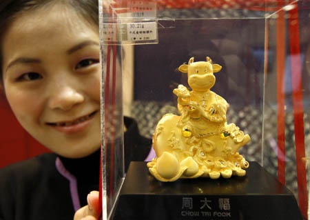 1月19日,廣西南寧一家商場(chǎng)的工作人員在展示一款“金!憋椘。 隨著農(nóng)歷牛年的臨近,各類牛黃金飾品紛紛面市。一款款栩栩如生、憨態(tài)可掬的“金牛”受到眾多消費(fèi)者的青睞。