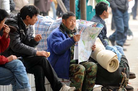 1月30日,求職民工在南京安德門民工就業(yè)市場找工作。當(dāng)日,南京市安德門民工就業(yè)市場結(jié)束春節(jié)假期重新開市,來自各地的大批民工早早進(jìn)場尋找工作。該民工就業(yè)市場的70多家職介所共準(zhǔn)備了2萬多個(gè)崗位,迎接民工節(jié)后進(jìn)城求職。