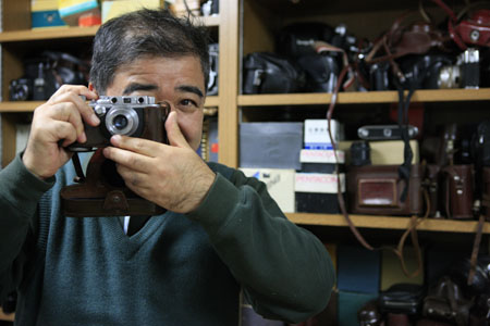 在位于東京偏北部的家中,河野手持其鐘愛的上海58相機(jī)。新華社記者:任正來(lái)