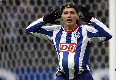 在德國足球甲級(jí)聯(lián)賽第18輪比賽中,柏林赫塔隊(duì)主場以2比1戰(zhàn)勝法蘭克福隊(duì),柏林赫塔隊(duì)球員潘特利奇以搞怪造型慶祝進(jìn)球。