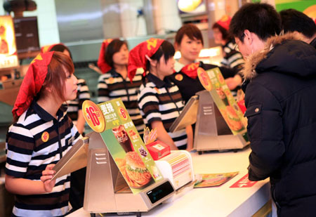 2月4日,麥當(dāng)勞(中國)有限公司在上海宣布,將在全國范圍的餐廳推出16.5元“天天超值套餐”。據(jù)稱,該系列套餐的價(jià)格優(yōu)惠高達(dá)32.6%。此舉顯示洋快餐巨頭為刺激銷量增長,以“超值套餐”的促銷方式調(diào)低產(chǎn)品的實(shí)際售價(jià)。圖為顧客在上海一麥當(dāng)勞餐廳內(nèi)購買食品。