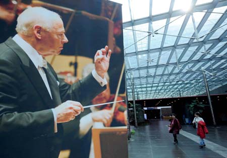 2月13日,觀眾從國家大劇院水下走廊懸掛的指揮大師海丁克的招貼畫旁走過。13日當(dāng)晚,海丁克和芝加哥交響樂團(tuán)把80分鐘的馬勒第六交響曲一氣呵成地在國家大劇院現(xiàn)場演奏。