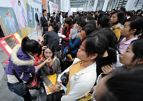 近日,“2009年春季廣西人才交流大會”在南寧市國際會展中心舉行,求職者除了要準(zhǔn)備好各種材料,也越來越重視個人形象。一些形象設(shè)計、服裝租賃、人才評價公司亮相人才交流會,受到眾多求職者的追捧。圖為在廣西南寧市國際會展中心,一名求職者在體驗免費形象設(shè)計。