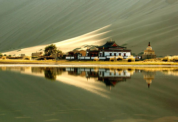 位于巴丹吉林沙漠深處的廟海子,又名蘇敏吉林海子,是沙漠腹地最美麗的景點(diǎn)之一,吸引眾多國(guó)內(nèi)外攝影師前來采風(fēng)。 廟海子被3座大沙山包圍,湖邊還有大片的平地,盡管只住著3戶人家,但巴丹吉林嘎查(村委會(huì))的駐地就在這里。 廟海子因湖畔有一座藏傳佛教寺廟而得名,寺廟院落不大,剛剛修葺過,正殿墻面白、紅、黃色相間,彩瓦飛檐,雕梁畫棟,墻壁上繪滿了佛教壁畫,藏經(jīng)閣里擺放著很多布裹的經(jīng)書,廟里燃著酥油燈和香,莊嚴(yán)肅穆。 巴丹吉林廟建有一人多高的圍墻,臨近湖邊矗立著一座白塔。廟后緊挨一座高大的沙峰,旁邊生長(zhǎng)著高大的白楊和柳樹。 臨近黃昏,夕陽灑在沙山和湖面上,水面映出寺廟、沙山和樹木的倒影,海子邊居民喂養(yǎng)的山羊和鴨子隨意而悠閑。 據(jù)記者了解,廟海子旁的寺廟名為巴丹吉林廟,建于1775年,正殿建筑分上下兩層,面積近300平方米。 年輕的喇嘛哈斯烏力吉說,相傳建設(shè)寺廟時(shí),一磚一瓦、一石一木都是靠人力背運(yùn)及牦牛和羊群馱運(yùn),費(fèi)盡了艱辛。 還有一件神奇之事,廟海子邊上有幾眼“靈泉”,叫“聽經(jīng)泉”。其中岸邊的一眼泉水出水處大若碗口,廟海子里還有更大的泉眼,噴涌而出的水花比兩三個(gè)臉盆還要大。 海子邊的居民告訴記者,當(dāng)旁人高聲呼喊或使勁跺腳時(shí),廟海子的泉眼會(huì)更猛烈地噴涌,聲音過后又會(huì)恢復(fù)原樣,頗為神奇。 一些居民說,昔日廟內(nèi)喇嘛眾多,每當(dāng)喇嘛高聲誦經(jīng),海子里的泉水就會(huì)泛起成片成片的水花,“聽經(jīng)泉”由此得名。 |