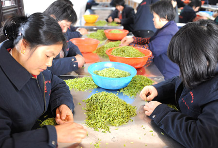 日,茶葉專(zhuān)業(yè)合作社的職工在分揀新摘的茶葉。 當(dāng)日,享譽(yù)海內(nèi)外的蘇州洞庭碧螺春茶在太湖洞庭東、西山開(kāi)始陸續(xù)采摘。據(jù)專(zhuān)家介紹,隨著近期氣溫上升,一周后蘇州洞庭碧螺春茶將大批量應(yīng)市,預(yù)計(jì)今年蘇州洞庭碧螺春茶產(chǎn)量為140多噸。洞庭碧螺春種植于太湖洞庭洞西山的果園之中,茶樹(shù)常年受太湖霧氣滋潤(rùn),并包吸四季花果之香,炒制的茶葉具有“條索纖細(xì),卷曲成螺,茸毛遍體,銀綠隱翠”之外形和“湯色碧綠、入口爽甜、回味無(wú)窮”之內(nèi)質(zhì),制作500克特級(jí)洞庭(山)碧螺春茶約需一芽一葉的嫩芽6萬(wàn)個(gè)左右。 |