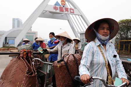 云南省近年來積極發(fā)展與越南的邊境貿(mào)易與經(jīng)濟(jì)合作,其中國家一類口岸云南河口邊境貿(mào)易十分活躍,每天有近萬名中越邊民進(jìn)行貿(mào)易往來。2007年至2008年,河口口岸的進(jìn)出口總值接近150億元。圖為越南邊民在河口口岸排隊(duì)等待進(jìn)關(guān)。