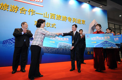 4月6日,北京市旅游局局長張慧光(前左)向山西太原旅游部門負責人交付北京新地標建筑國家體育場“鳥巢”、國家游泳中心“水立方”以及國家大劇院等景點免費門票的大票樣。 當日,山西旅游專列抵達北京,北京市旅游局在北京西客站為620名游客舉行了簡短而熱烈的歡迎儀式。這是全國鐵路4月1日零時起開始實施新的列車運行圖后,旅游區(qū)域合作出現的新舉措。有關人士認為,國內旅游隨著鐵路基礎設施的逐步完善,正在迎來“動車時代”。