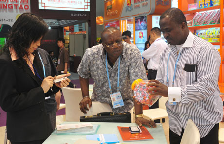 5月5日,尼日利亞客商在廣交會(huì)上采購糖果。