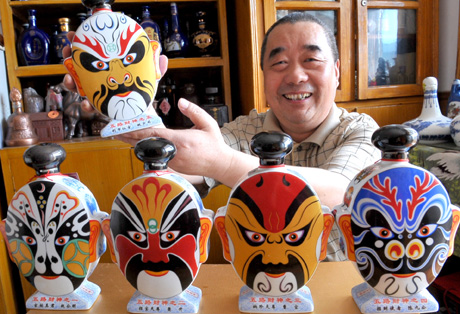 王金平展示收藏的臉譜系列酒瓶。新華社發(fā)