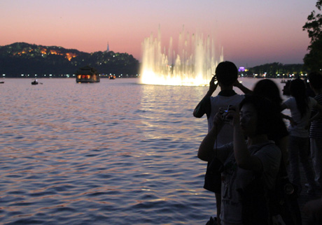 5月9日,杭州西湖游船黃昏游和夜游啟動,眾多游客爭相觀賞如夢如幻的“人間天堂”夜景。今年西湖夜游時間將持續(xù)到10月上旬。新華社發(fā)