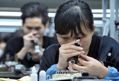 廣州市番禺區(qū)的400多家珠寶玉石企業(yè)為應(yīng)對(duì)金融危機(jī)給出口帶來(lái)的沖擊,積極開(kāi)拓國(guó)內(nèi)市場(chǎng)。2008年,番禺珠寶外銷(xiāo)總額13億美元,同比增長(zhǎng)6.47%,而內(nèi)銷(xiāo)同比增長(zhǎng)70%。圖為廣州番禺珠寶產(chǎn)業(yè)發(fā)展中心一家珠寶企業(yè)的員工在車(chē)間工作。