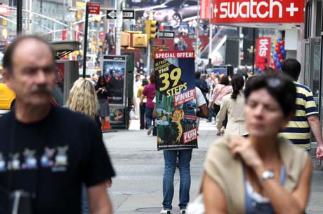 在美國(guó)紐約百老匯大道上有這樣一群人,胸前和身后各背著一塊廣告看板,自己的身子夾在兩塊看板中間,一邊向路人發(fā)放百老匯最新劇目的宣傳單,一邊嘴里還不停地宣傳劇目——人們給了他們一個(gè)很形象的稱(chēng)呼“夾心廣告”。自經(jīng)濟(jì)不景氣以來(lái),百老匯的“夾心廣告”也越來(lái)越多了。 圖為一名“夾心廣告”站在美國(guó)紐約百老匯大道上。