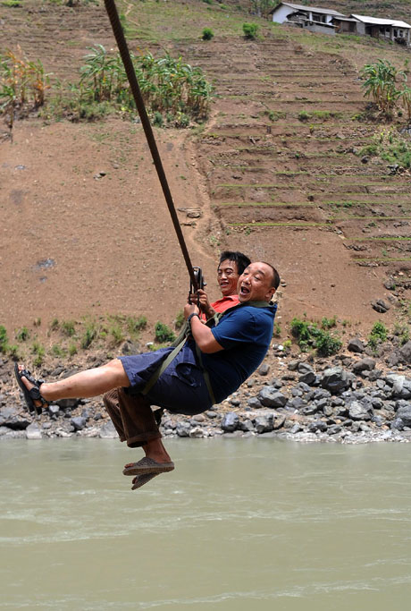 5月24日,一名游客(前)在當地群眾的陪伴下在云南省怒江傈僳族自治州瀘水縣境內的怒江河谷溜索。 溜索是怒江河谷最具代表性的原始交通工具之一,曾經是當地群眾過江的主要方式。如今橫架在怒江上的橋越來越多,但溜索仍然沒有退出歷史舞臺。除在一些偏遠的高山峽谷地帶,溜索作為交通工具仍然在使用外,現在怒江溜索已經成為一種新興旅游項目,越來越多的海內外游客來到怒江都要體驗溜索這種“勇敢者的運動”,感受凌空飛溜的驚險與刺激。