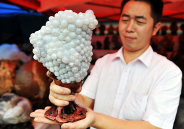 7月10日,一名奇石收藏者在展示葡萄瑪瑙石。