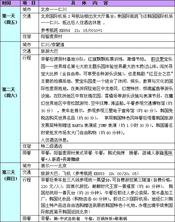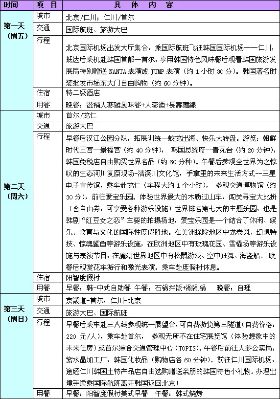 行程報價:2880元/人,憑華聲在線王建五的博客優(yōu)惠券:(http://wangjianwu.blog.voc.com.cn)每人可優(yōu)惠300元,售價僅為2580元/人。 費用包含以下內容:韓國全程特二級酒店以上標準或韓式渡假村/房間2人1間/1日3餐/全程華語導游;包含國際及境外交通費/全程機場稅/第一景點門票/簽證費/旅行社責任險;全程活動拓展組織費。 不含護照費/國內交通費/個人消費/小費(30元/人天),自費項目和旅游意外傷害保險。