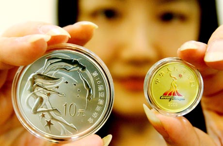 8月3日,由中國人民銀行發(fā)行、中國金幣總公司總經(jīng)銷的2010年第16屆亞洲運動會金銀紀念幣(第1組)現(xiàn)身蘇州,并于8月4日起在該市姑蘇金店正式對外銷售。該金銀紀念幣共兩枚,其中1/4盎司金幣1枚,1盎司銀幣1枚,均為中華人民共和國法定貨幣。(新華社發(fā))